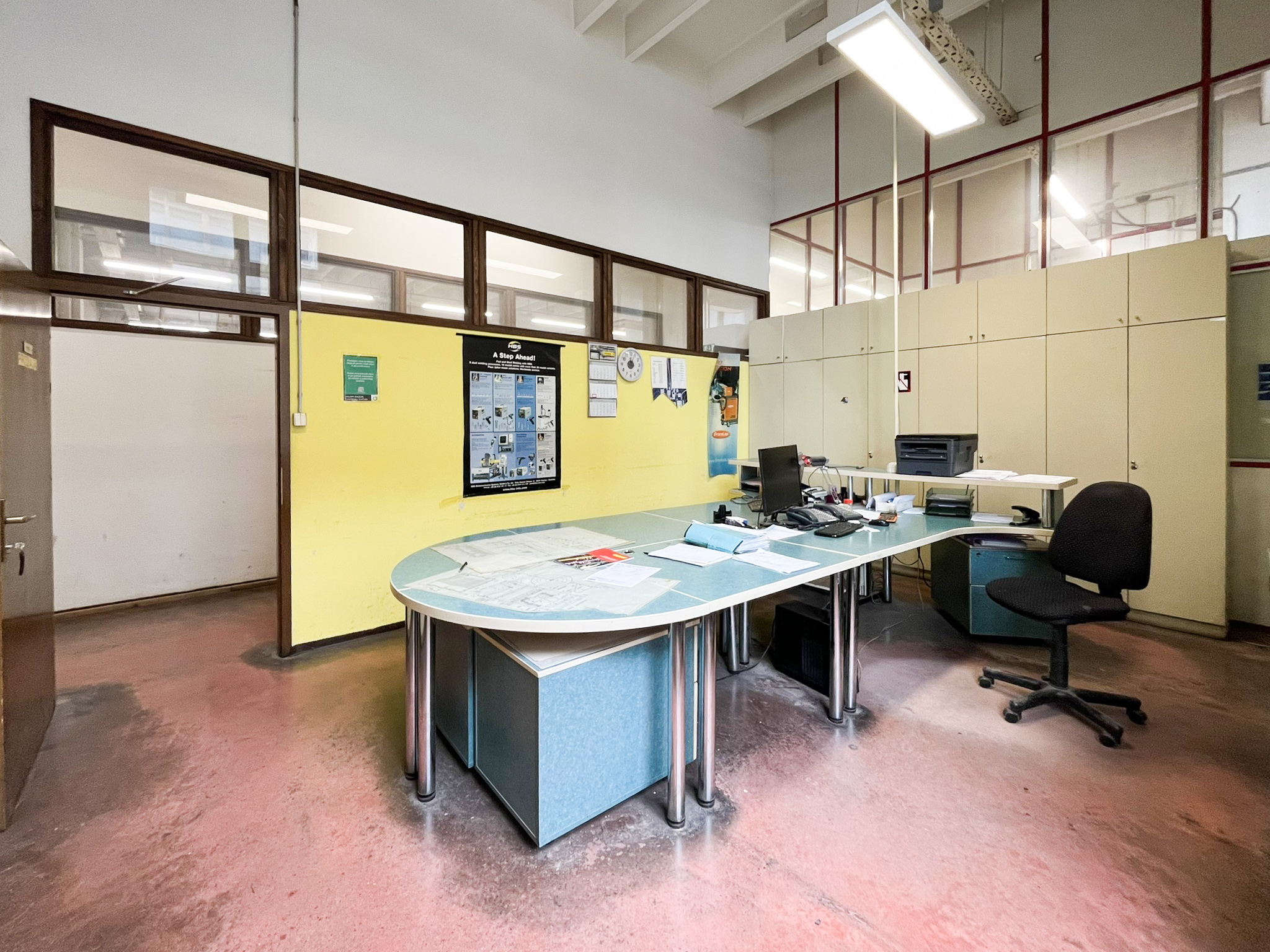Trenutno je poslovni prostor razdeljen v tri enote: 378 m2 je pisarn, 540 m2 proizvodnje in 613 m2 skladišča. Možno preurediti tudi kot enoten poslovni prostor. Tloris prostora prilagamo.